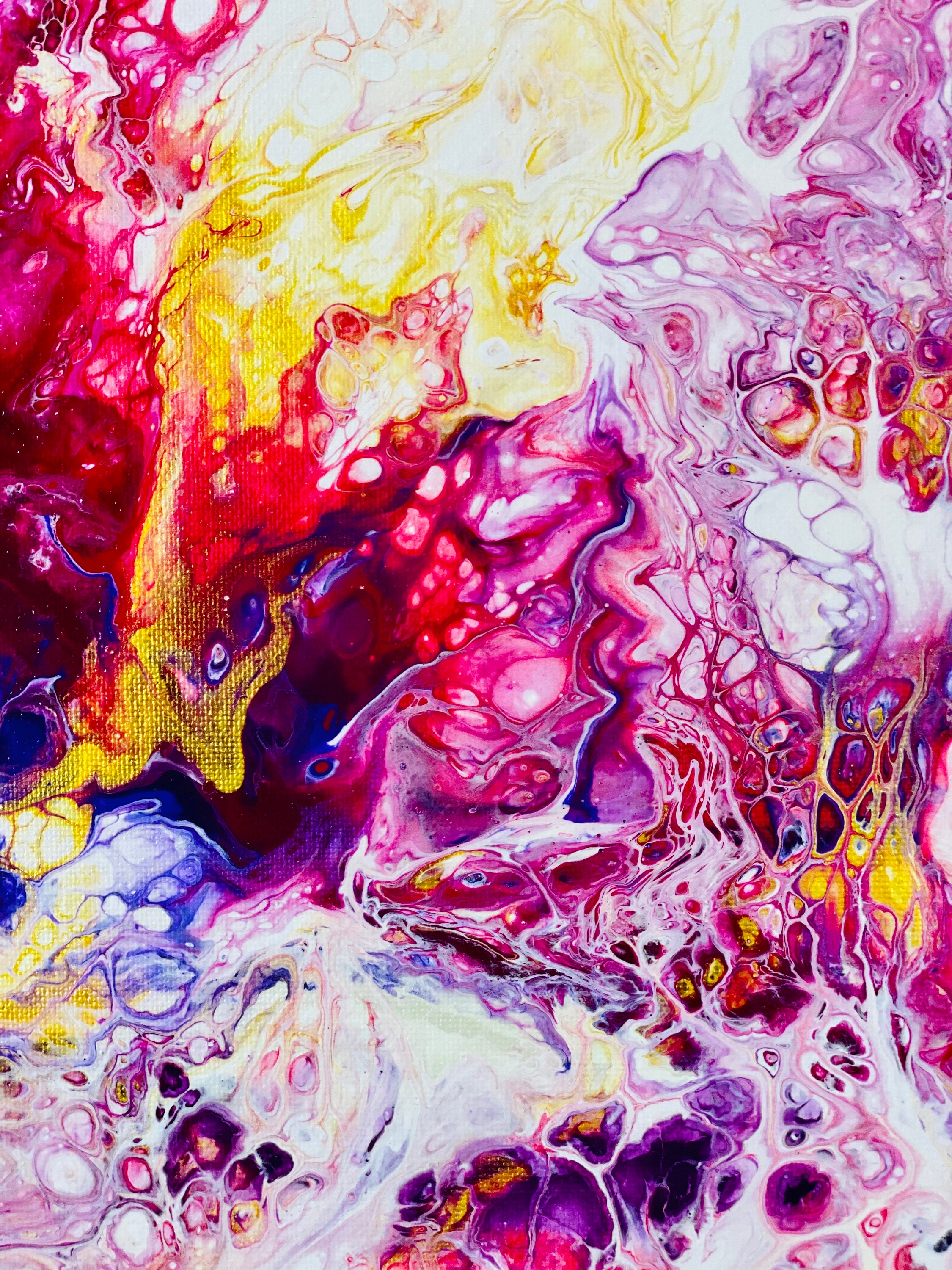 Large 24X30" acrylic pour painting - beautiful reds, oranges, purples, yellows with negative white space. This is a stunning one of a kind piece for any room or office. Varnish sealed and easy to hang. Can be hung horizontal or vertical, your choice!